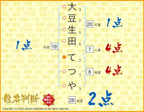 生活面を象徴する運勢です。外部から受ける影響力を表し、結婚運、家庭運や職場、環境への順応性を表します。総運から人運を引いた画数。姓や名が1文字の場合を除く。