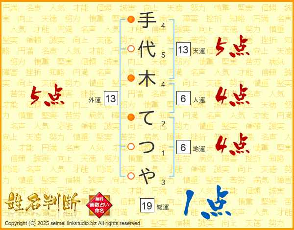 手(4画)代(5画)木(4画) て(2画)つ(1画)や(3画)