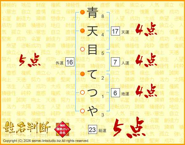 あなたの人生を表す1番重要な運勢です。生涯を通じて影響する総合運となり、主に50歳以降の晩年期に影響を及ぼします。苗字と名前の合計画数。