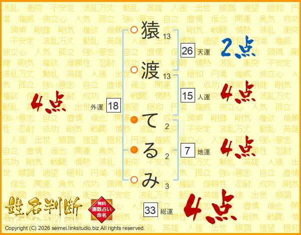 猿渡てるみさんの総運は33画の4点!