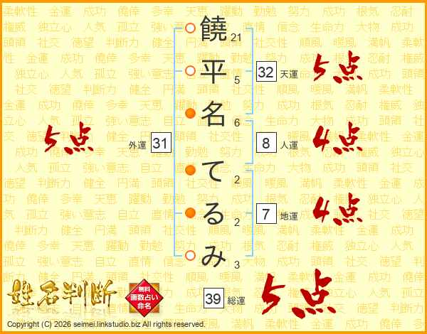 饒平名てるみさんの総運は39画の5点!