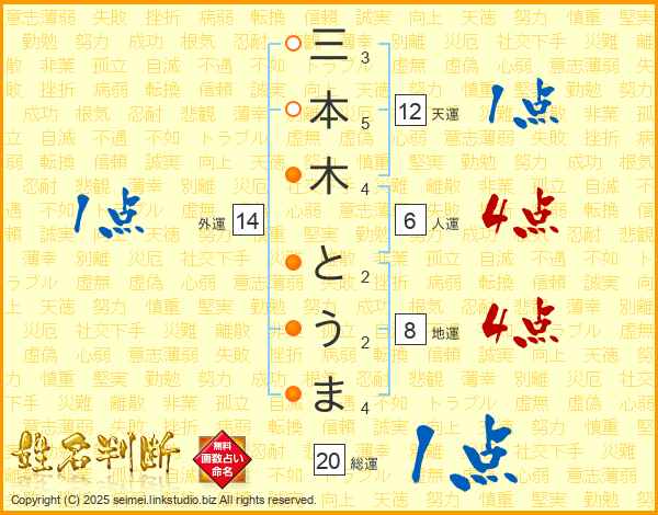 生活面を象徴する運勢です。外部から受ける影響力を表し、結婚運、家庭運や職場、環境への順応性を表します。総運から人運を引いた画数。姓や名が1文字の場合を除く。