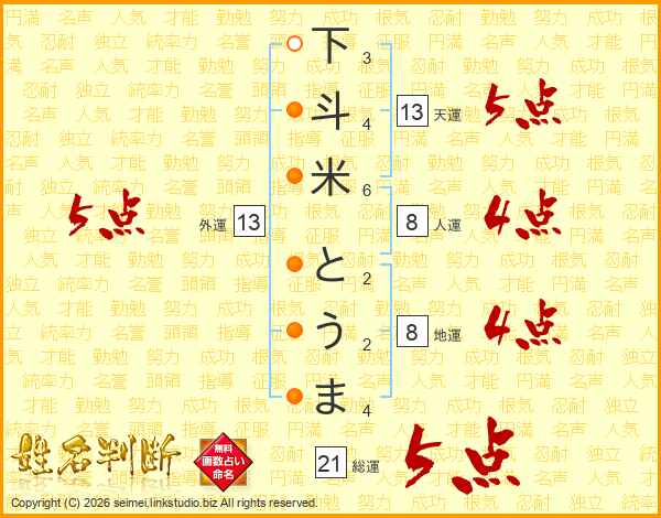 下(3画)斗(4画)米(6画) と(2画)う(2画)ま(4画)