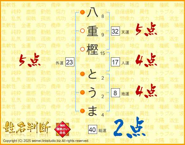 生活面を象徴する運勢です。外部から受ける影響力を表し、結婚運、家庭運や職場、環境への順応性を表します。総運から人運を引いた画数。姓や名が1文字の場合を除く。
