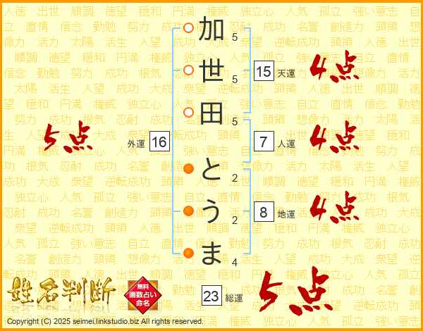 加(5画)世(5画)田(5画) と(2画)う(2画)ま(4画)