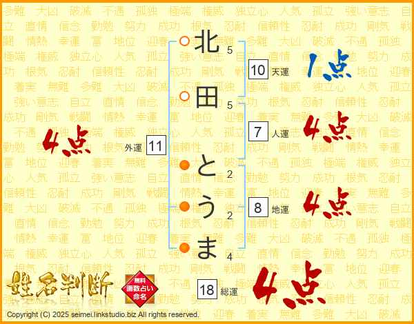 生活面を象徴する運勢です。外部から受ける影響力を表し、結婚運、家庭運や職場、環境への順応性を表します。総運から人運を引いた画数。姓や名が1文字の場合を除く。