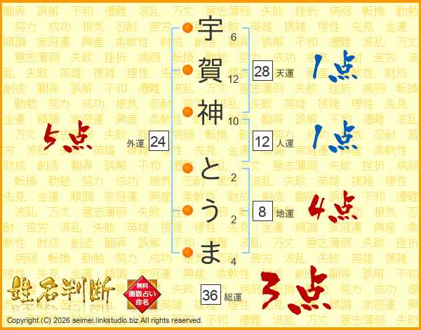 宇賀神とうまさんの総運は36画の3点!