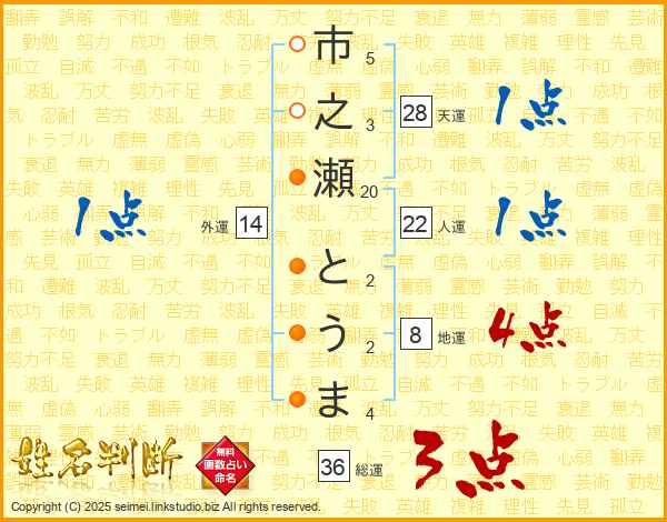 生活面を象徴する運勢です。外部から受ける影響力を表し、結婚運、家庭運や職場、環境への順応性を表します。総運から人運を引いた画数。姓や名が1文字の場合を除く。