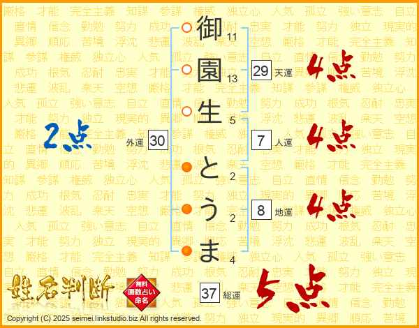 御(11画)園(13画)生(5画) と(2画)う(2画)ま(4画)