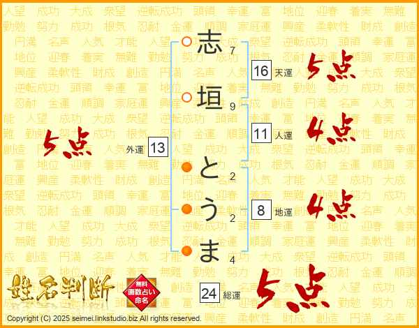 志(7画)垣(9画) と(2画)う(2画)ま(4画)