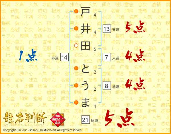 戸(4画)井(4画)田(5画) と(2画)う(2画)ま(4画)