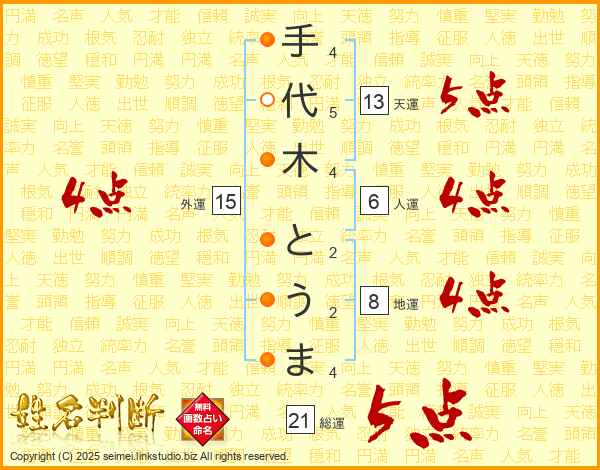 あなたの人生を表す1番重要な運勢です。生涯を通じて影響する総合運となり、主に50歳以降の晩年期に影響を及ぼします。苗字と名前の合計画数。