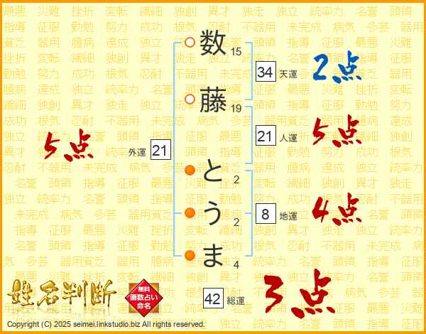 生活面を象徴する運勢です。外部から受ける影響力を表し、結婚運、家庭運や職場、環境への順応性を表します。総運から人運を引いた画数。姓や名が1文字の場合を除く。