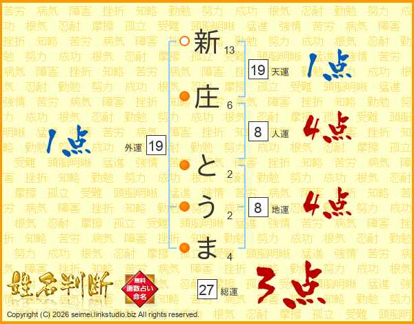 新(13画)庄(6画) と(2画)う(2画)ま(4画)