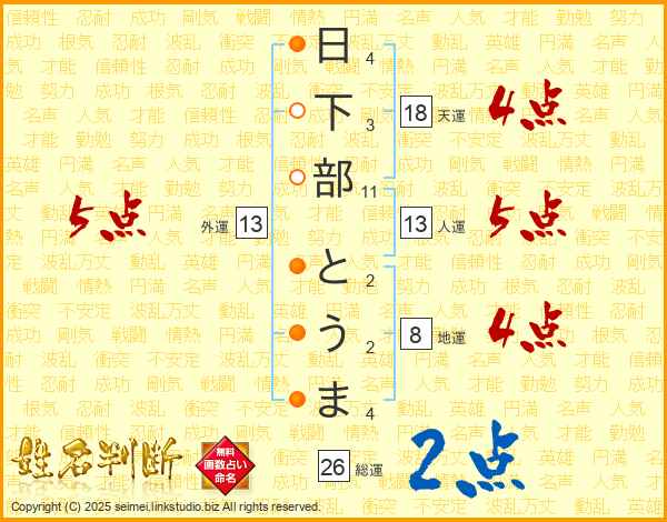 生活面を象徴する運勢です。外部から受ける影響力を表し、結婚運、家庭運や職場、環境への順応性を表します。総運から人運を引いた画数。姓や名が1文字の場合を除く。