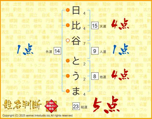 日(4画)比(4画)谷(7画) と(2画)う(2画)ま(4画)