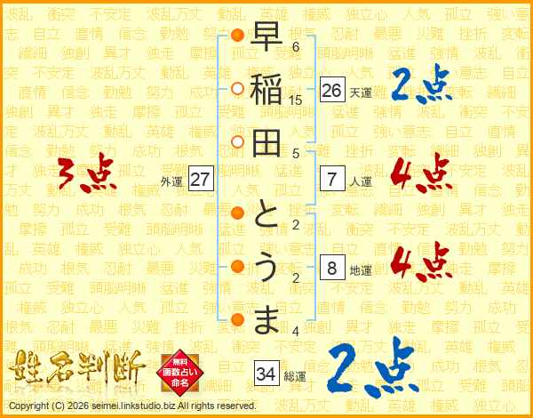 早(6画)稲(15画)田(5画) と(2画)う(2画)ま(4画)