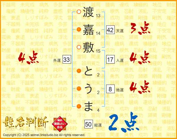 生活面を象徴する運勢です。外部から受ける影響力を表し、結婚運、家庭運や職場、環境への順応性を表します。総運から人運を引いた画数。姓や名が1文字の場合を除く。