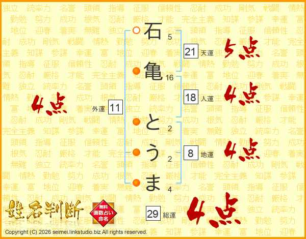 石(5画)亀(16画) と(2画)う(2画)ま(4画)