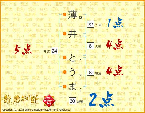 薄(18画)井(4画) と(2画)う(2画)ま(4画)