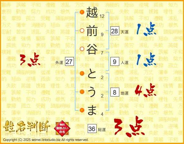 生活面を象徴する運勢です。外部から受ける影響力を表し、結婚運、家庭運や職場、環境への順応性を表します。総運から人運を引いた画数。姓や名が1文字の場合を除く。