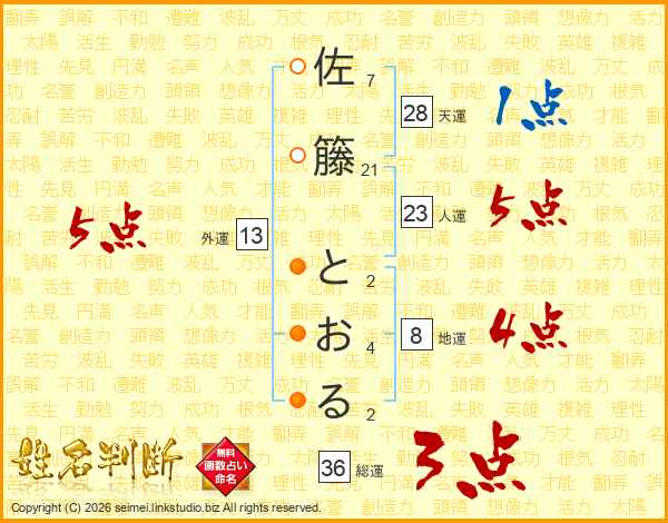 佐籐とおるさんの外運は13画の5点!