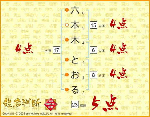 あなたの人生を表す1番重要な運勢です。生涯を通じて影響する総合運となり、主に50歳以降の晩年期に影響を及ぼします。苗字と名前の合計画数。