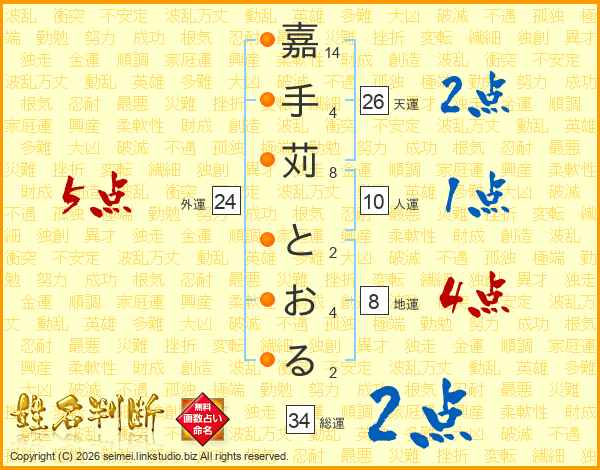 嘉(14画)手(4画)苅(8画) と(2画)お(4画)る(2画)