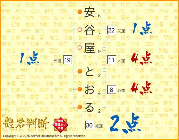 生活面を象徴する運勢です。外部から受ける影響力を表し、結婚運、家庭運や職場、環境への順応性を表します。総運から人運を引いた画数。姓や名が1文字の場合を除く。