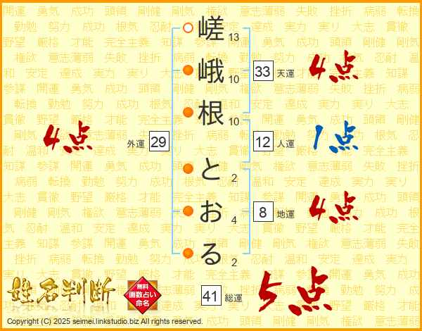 嵯峨根とおるさんの総運は41画の5点!