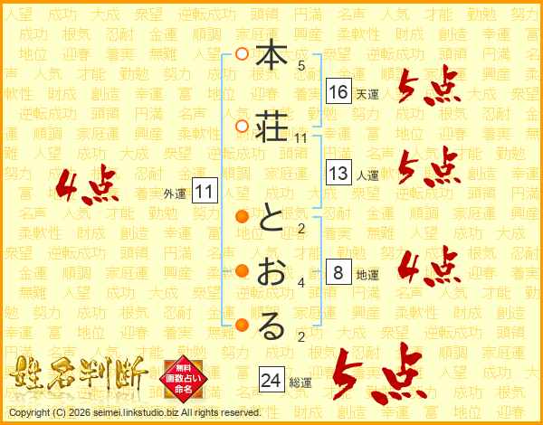 本荘とおるさんの人運は13画の5点!