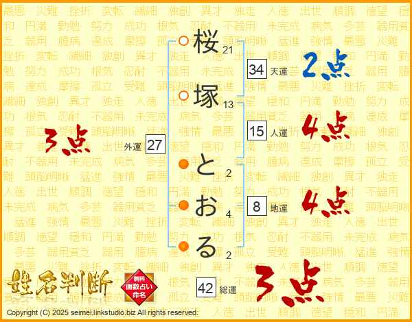 桜(21画)塚(13画) と(2画)お(4画)る(2画)