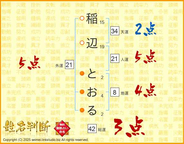 稲(15画)辺(19画) と(2画)お(4画)る(2画)