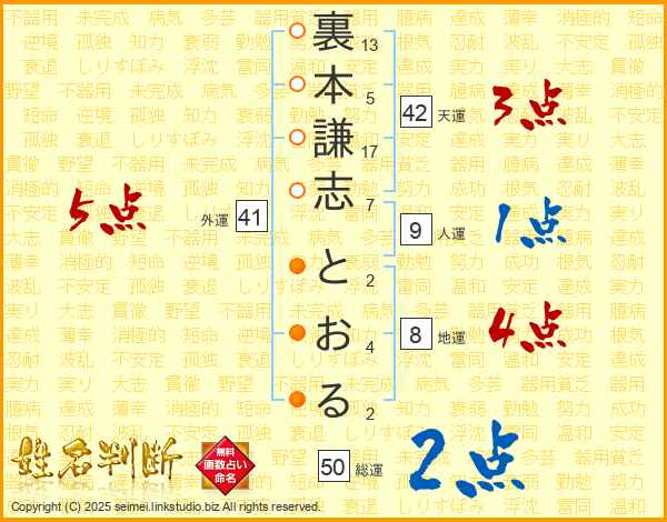 裏(13画)本(5画)謙(17画)志(7画) と(2画)お(4画)る(2画)