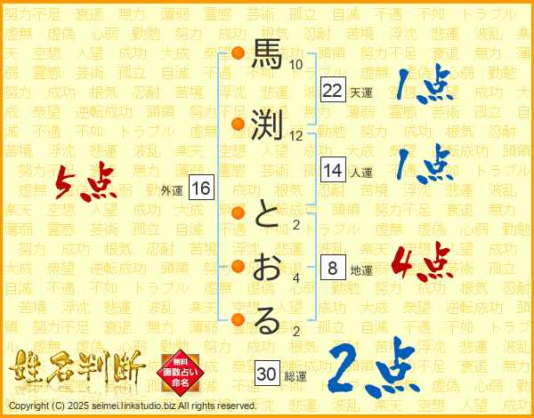 生活面を象徴する運勢です。外部から受ける影響力を表し、結婚運、家庭運や職場、環境への順応性を表します。総運から人運を引いた画数。姓や名が1文字の場合を除く。