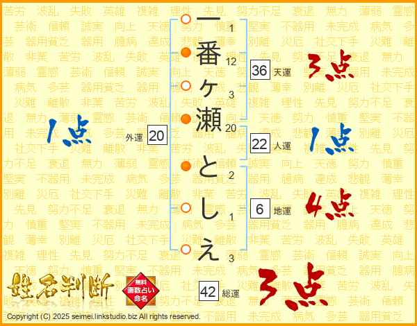 一番ヶ瀬としえさんの総運は42画の3点!