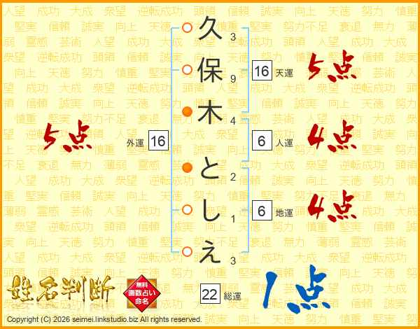 久(3画)保(9画)木(4画) と(2画)し(1画)え(3画)
