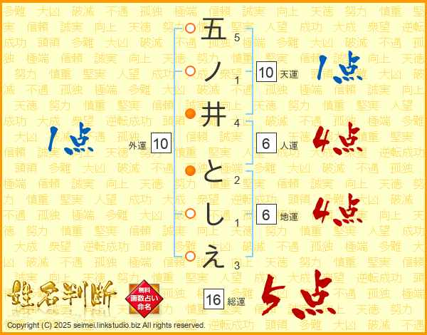 生活面を象徴する運勢です。外部から受ける影響力を表し、結婚運、家庭運や職場、環境への順応性を表します。総運から人運を引いた画数。姓や名が1文字の場合を除く。