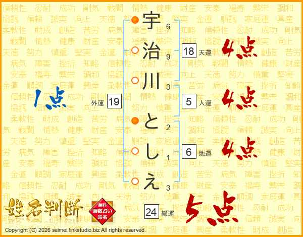 宇(6画)治(9画)川(3画) と(2画)し(1画)え(3画)