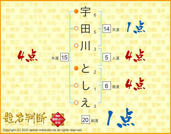生活面を象徴する運勢です。外部から受ける影響力を表し、結婚運、家庭運や職場、環境への順応性を表します。総運から人運を引いた画数。姓や名が1文字の場合を除く。