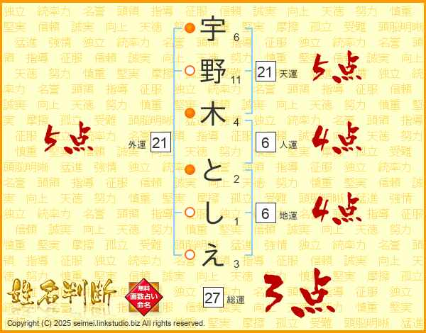 宇(6画)野(11画)木(4画) と(2画)し(1画)え(3画)