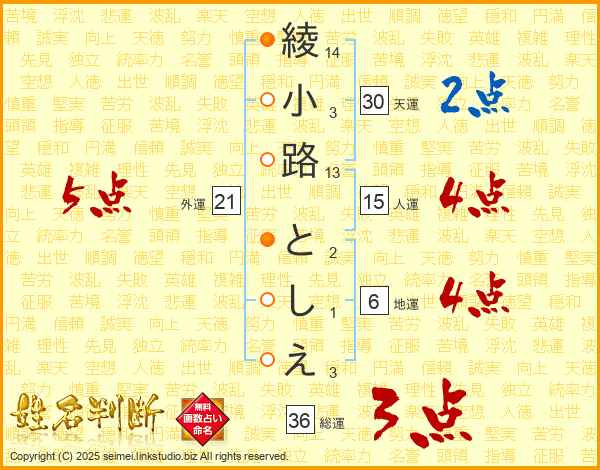 綾(14画)小(3画)路(13画) と(2画)し(1画)え(3画)