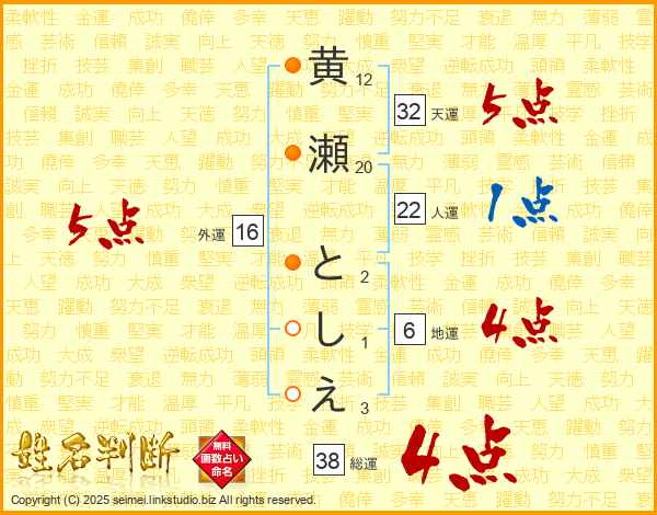 黄(12画)瀬(20画) と(2画)し(1画)え(3画)