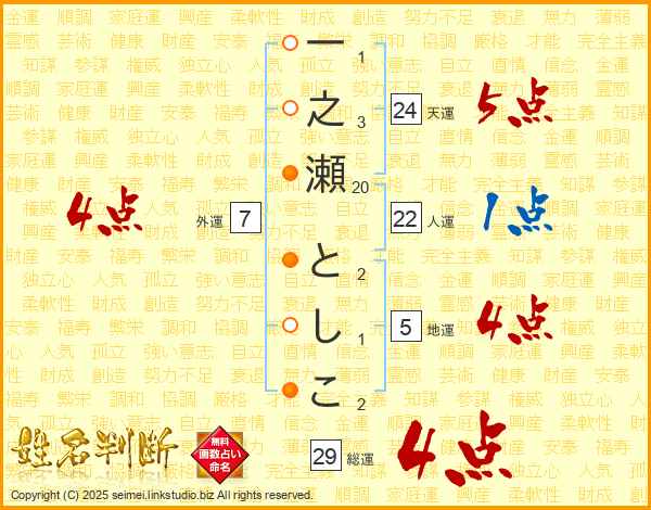 一(1画)之(3画)瀬(20画) と(2画)し(1画)こ(2画)