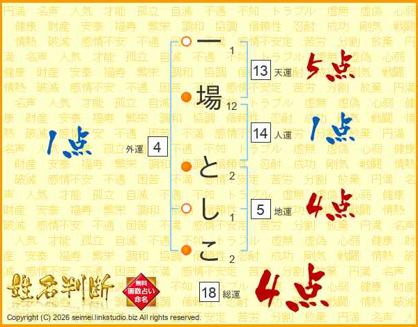 生活面を象徴する運勢です。外部から受ける影響力を表し、結婚運、家庭運や職場、環境への順応性を表します。総運から人運を引いた画数。姓や名が1文字の場合を除く。