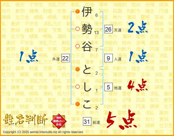 伊(6画)勢(13画)谷(7画) と(2画)し(1画)こ(2画)