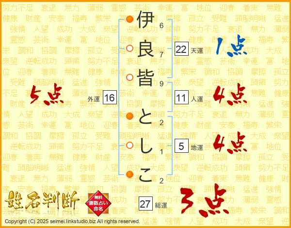 伊(6画)良(7画)皆(9画) と(2画)し(1画)こ(2画)
