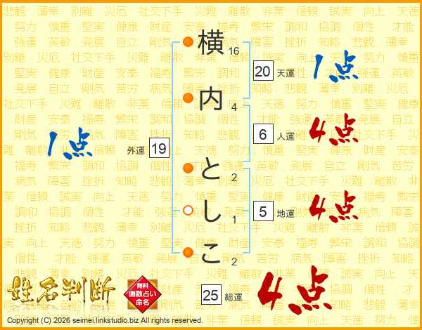 生活面を象徴する運勢です。外部から受ける影響力を表し、結婚運、家庭運や職場、環境への順応性を表します。総運から人運を引いた画数。姓や名が1文字の場合を除く。