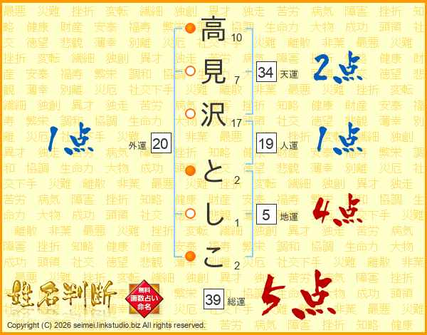 高(10画)見(7画)沢(17画) と(2画)し(1画)こ(2画)