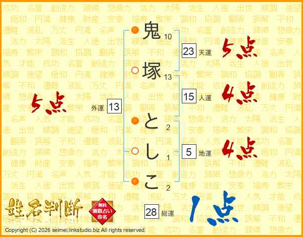鬼(10画)塚(13画) と(2画)し(1画)こ(2画)